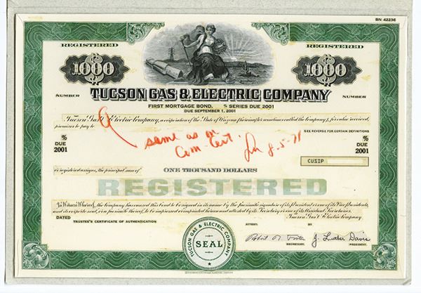 Arizona, $1000 Production Material %Odd Registered First Mortgage Bond on hard cardstock, Black text with green border and underprint. Lot includes edits and notes made during the bond production process. VF, SCBN. Unique.