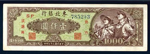 1000 Yuan, P-S3758 (S/M#T213-52.5), Issued banknote, Brown and ochre underprint with farmers on right, back brown violet, PMG graded About Uncirculated 50, attractive note rarely found this nice. Only 4 graded in PMG census.
