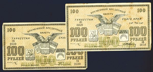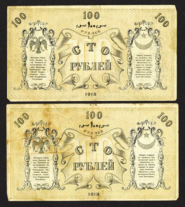 Russia, Turkestan District, pair of issued 100 Rouble notes, P-S1168, black on yellow-brown underprint, two signature varieties, both VF.