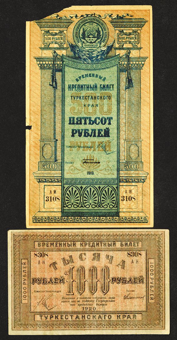 Russia - Russian Central Asia. 500, 1000 Rubles. P-S1172 Very Fine but some paper loss at top left corner; S1173 Nice Very Fine with pencil notation in back margin. 2 scarce pieces. (The Silicon Valley Collection)
