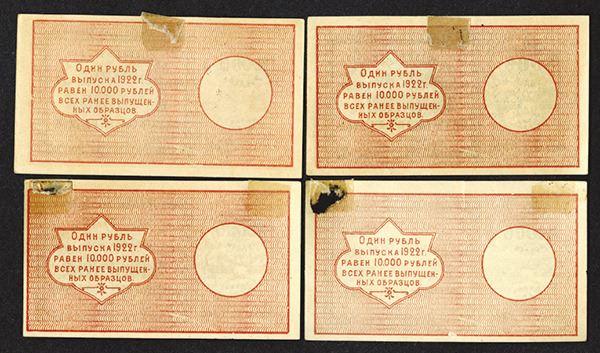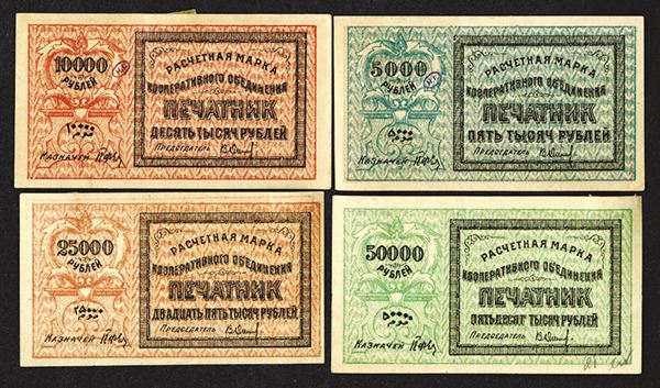 Russia, Lot of 4 notes, all unlisted in SCWPM, Includes 5000 Rubles; 10,000 Rubles; 25,000 Rubles and 50,000 Rubles, all in different colors, Choice XF to AU and all with light hinge remnants on back from previous mounting that can be removed. Attractive and rare private issues.