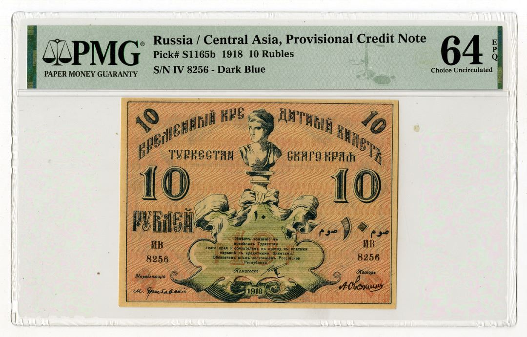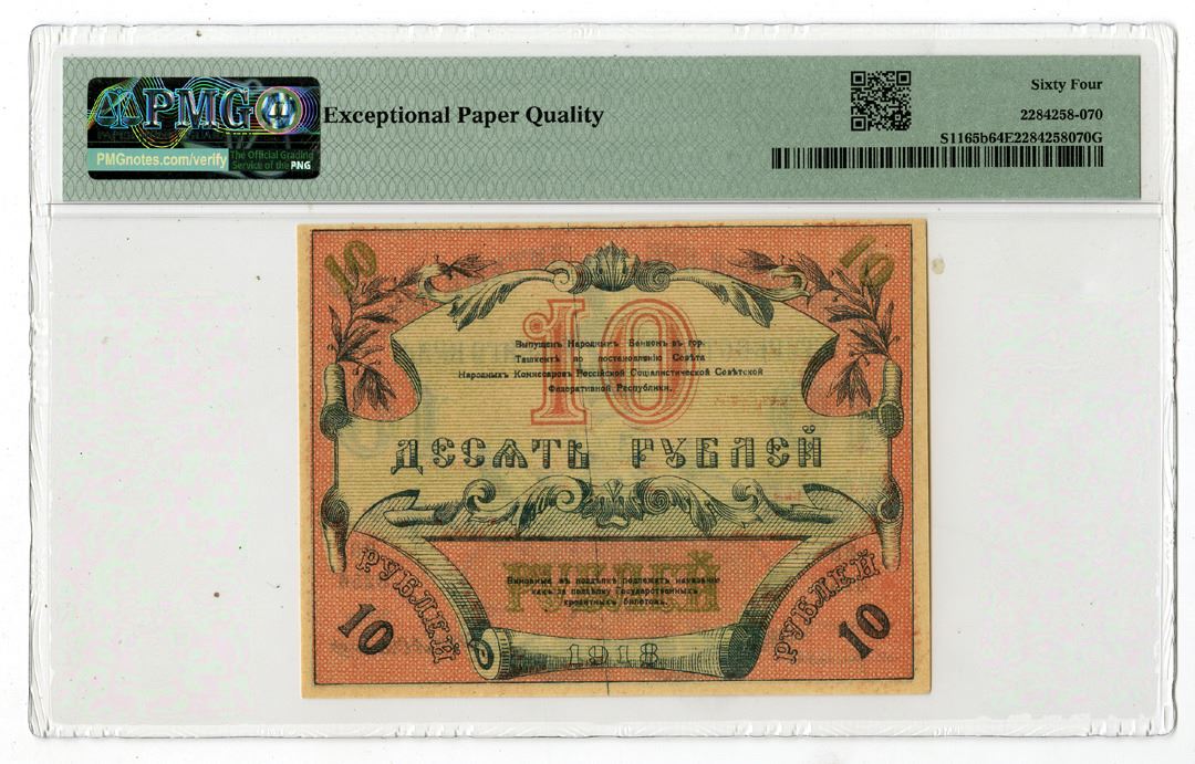 Russia, 1918. 10 Rubles, P-S1165b, Issued Banknote, Blue on pink underprint, S/N IV 8256, PMG graded Choice Uncirculated 64 EPQ. Tied with one other note as highest graded out of 10 graded in the PMG census.