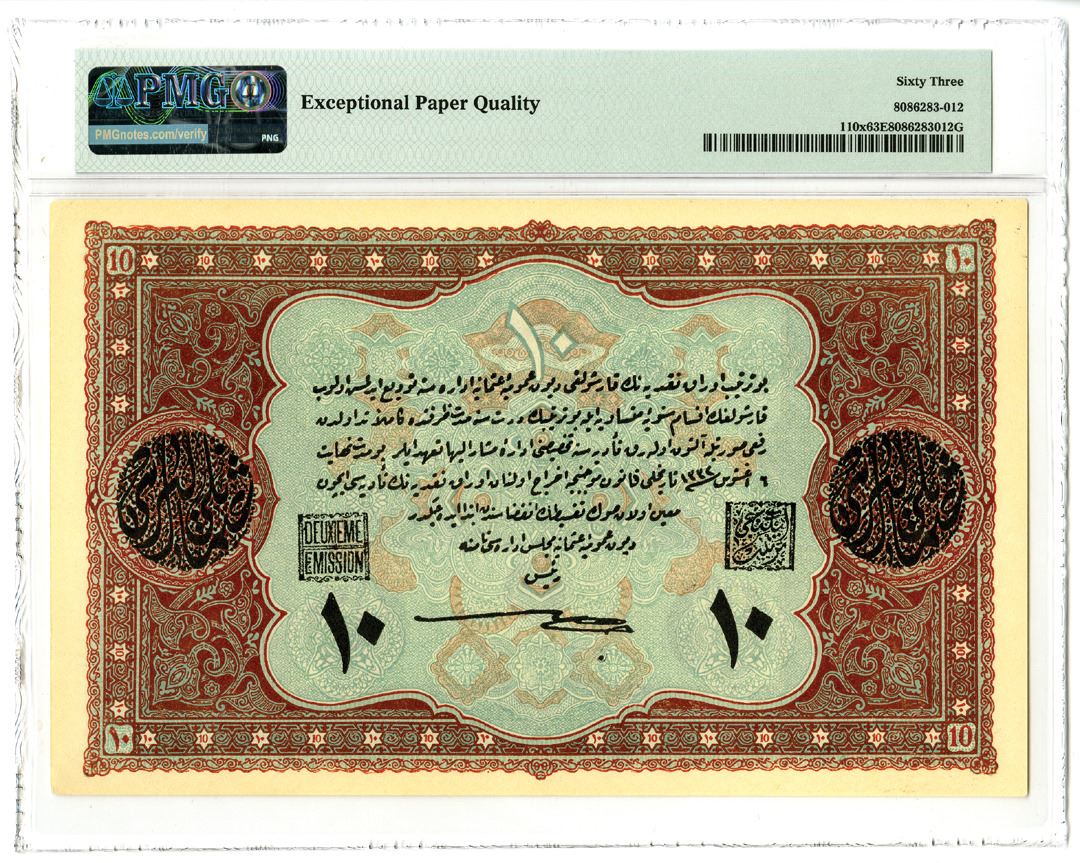 Turkey. 1918 / AH1334. 10 Livres - Without Watermark, P-110x, Issued banknote, Brown frame with light blue underprint, S/N A013222 - With "Deuxieme Emission" Stamp, PMG graded Choice Uncirculated 63 EPQ.