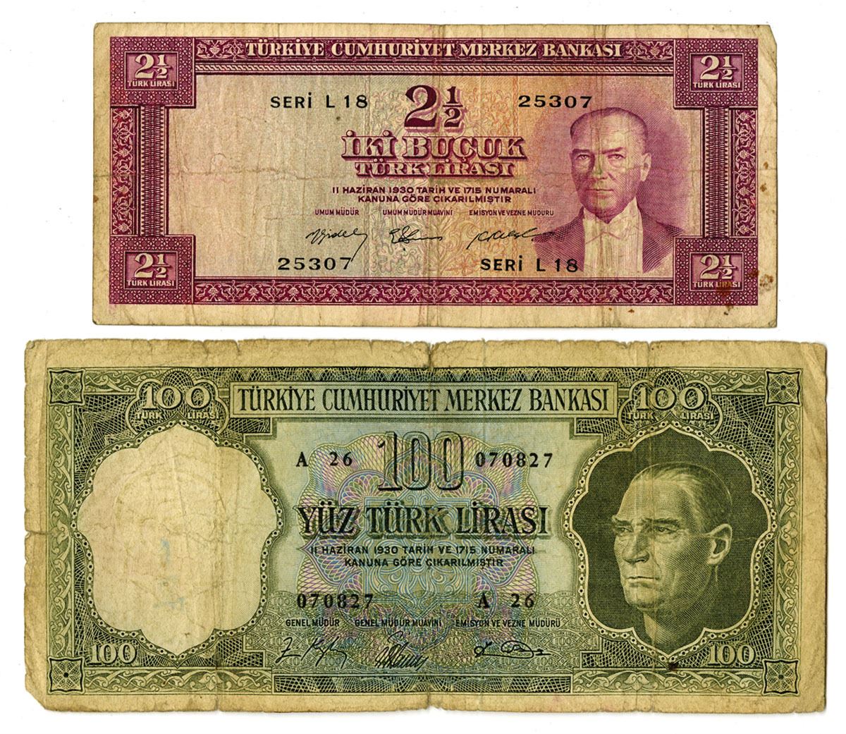 Turkey, L.1930 (1952-1964). Lot of 2 Issued Banknotes, Includes: 2 1/2 Lira, P-151a, TDLR and 100 Lira, P-177a, DBM-A. Notes range from Good to Fine condition. (2). Sold "AS IS" no returns accepted.