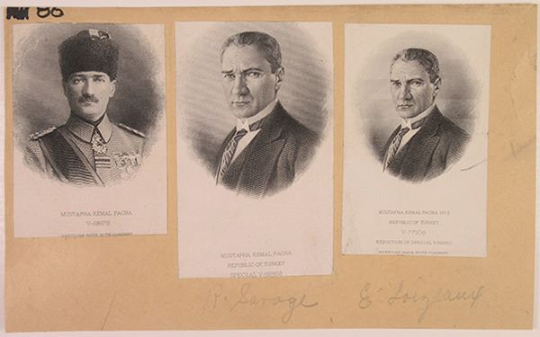 Turkey. Lot of 3 proof vignettes printed in black on india paper that is mounted on thin manila card with additional archival notations including 2 of the vignettes listing the artists written right below the images. The vignettes include 2 with Mustapha Kemal Pacha in a suit and tie and the 3rd with him in uniform. R.Savage had one design and the second by E. Laizeaux. All are in XF to Uncirculated condition. They are similar but none were used on banknotes. ABNC. (3)