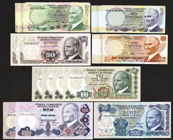 Turkey. 11 Haziran 1930. 5, 10, 20 Lirasi. P-179, 180, 181b. BB (Banknote Book) 262a (All 5 series), b (Both series), 263a (2 series), b (All 3 series, 1 is Fine), 264b (Both series, 1 is Fine). 14 Cecak 1970. 5, 10, 20, 50, 100, 500, 1000 Lirasi. P-185, 186, 187a, b, 188, 189, 190, 191. BB 262c (All 6 series), 263a (4 series), c (2 series), d (2 series), e (2 series), f, 265a, c, 266a, b, c, d, 267b (Low serial # 0000621), 268c (Fine), e. All Very Choice Uncirculated excepted as noted. 40 pieces. (Arthur C. Matz Collection)