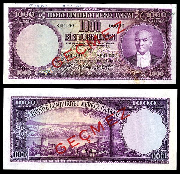 Turkey, ND L.1930 (1953 but ink notation on top is dated 5-1-(19)51), 1000 Lira, P-172s, Purple on m/c, President Ataturk at right, Red “Specimen” over print in Turkish in middle and pin punch “Cancelled” bottom middle, the note appears uncirculated at first glance but there are 2 light vertical folds on the right and middle of the note which relegates this lovely note to Choice XF to AU condition. Rare note in any condition and unpriced as specimen in SCWPM. BWC.