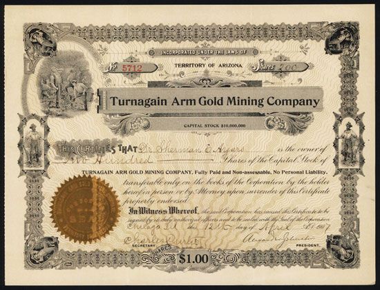 Alaska, 1907, 100 Shares, #5712, I/U stock certificate, Slate border with Men Mining vignettes, Gold Company seal, XF condition. Mines probably located in the Hope-Sunrise area on the Turnagain Arm side of the Kenai Peninsula, where gold was discovered in 1895. This area is not far from the very first discovery of gold in Alaska by the Russians in 1849. Scarce Alaska mining stock.