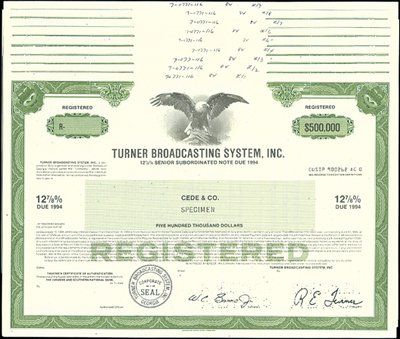 GA. 1984. Specimen. 9 different registered bonds. All are 12 7/8% Notes Due 1994. All are in green with eagle vignette. Denominations range from $ odd to $500,000. Rare group of Ted Turner's certificates, the founder of CNN's Headline News. Facsimile signature of R.E. "Ted" Turner. Rare bonds. ABNC. XF.
