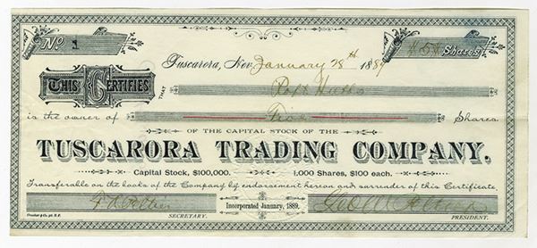 Tuscarora, Nevada. 5 Shares, I/U small size certificate for 5 shares, S/N 1, embossed and signed. VF. Tuscarora Trading company became Elko-Tuscarora Mercantile Company) - Elko, Nevada 1889. Rare #1 stock certificate. Crocker & Co., S.F.