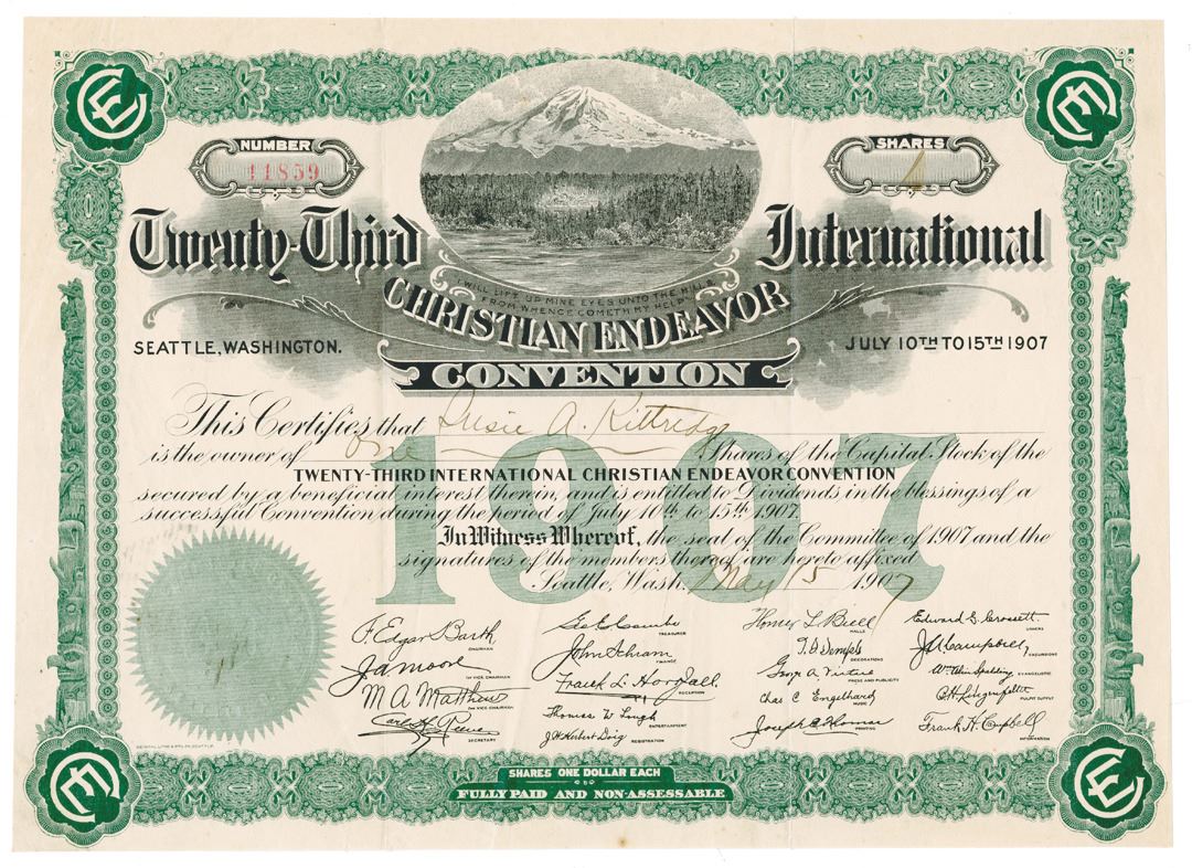 Seattle, Washington. 1 Share Issued Capital Stock Certificate, Black print on green border and under tint, Mount Rainier at top, VF-XF condition, General Litho & Ptg Co.