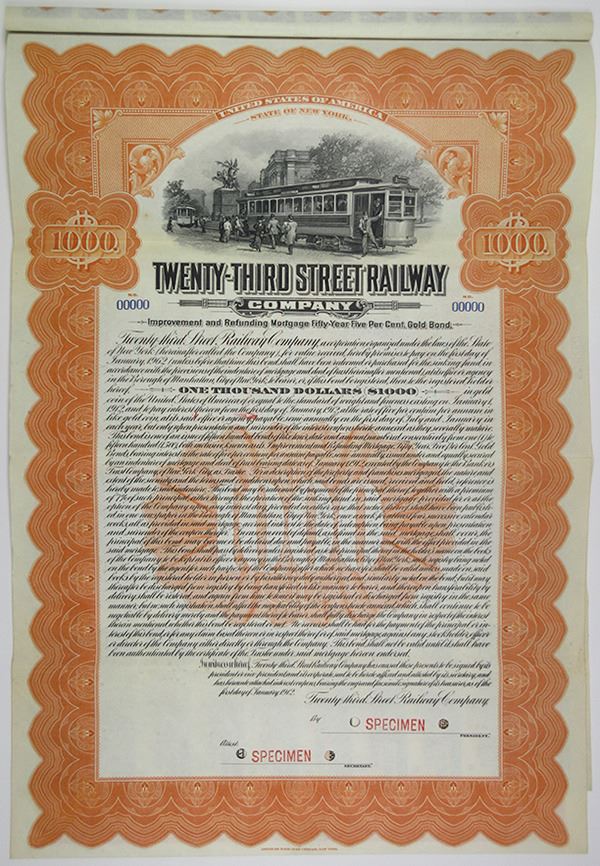 New York. $1000 Specimen 5% Improvement and Refunding Mortgage Gold Coupon Bond, Black text with orange border and undertint, Illustration of passengers disembarking from a trolly car at top. Red specimen overprints, "00000" serial numbers in blue, and POC's, VF-XF condition, Printed by ABNC.