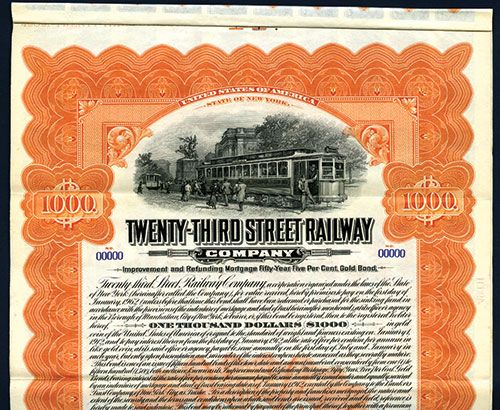 New York, 1912, $1000, 50 Year 5% Improvement and Refunding Gold Specimen Bond, Black on orange border and underprint, Vignette of people boarding electric trolley top center, POC's red SPECIMEN overprints and blue s/n “00000 “, VF condition, ABNC. Listed railroad and bond in Cox.
