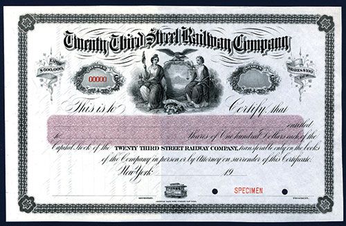 New York, 19xx, Specimen Stock, Odd Shares, Allegorical figures top center with little trolley bottom center, POC's, VF-XF condition, ABNC.