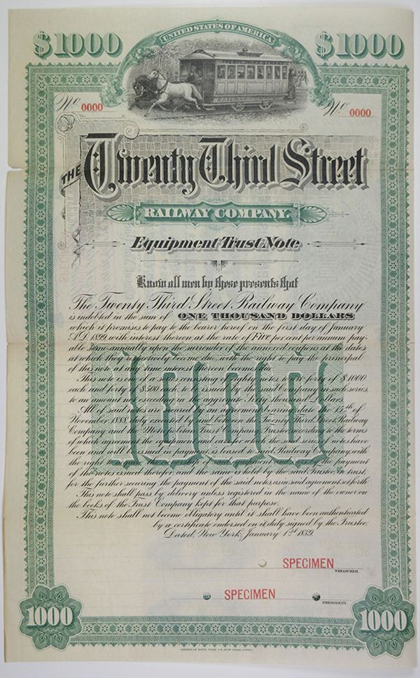 New York. $1000 Specimen 5% Equipment Trust Note Coupon Bond, Black text with green border and undertint, depiction of horses pulling trolly car on tracks at top. Red specimen overprints, "0000" serial numbers and POC's, Fine condition with Archivally reinforced folds and a 1/4 inch split at left margin, Printed by ABNC. Unknown color and denomination in Cox. This is the only example found.