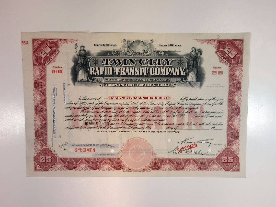 Minnesota. (Inc. in NJ), Twin City Rapid Transit Co., 1930s 25 Shrs Specimen Stock Certificate, VF. Unlisted share denomination (25 Shares in Cox) and Color. Only known as a specimen. ABNC. Rare. The Twin City Rapid Transit Company, also known as Twin City Lines, was a transportation company that operated streetcars and buses in the Minneapolis-St. Paul metropolitan area in the U.S. state of Minnesota.