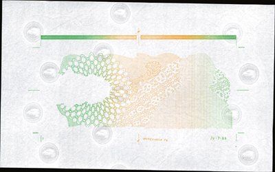 Venezuela. Tyvek Banco Central De Venezuela Production Proof. 1980-82. P-57 Tyvek Unlisted. 10 Bolivares Unique Tyvek color separation, under tint, progress proof. Proof of intricate cycloid designs used as the under tint for P-57. Evidently an experimental note, since no examples are known of a fully printed P-57 Tyvek note. This is one of 4 different variations of the under tint printed on Tyvek paper that will be offered. No text on the bottom. Also dated on the bottom "10-7-80 Venezuela10" that is printed. Watermark of ABNC eagle in circle repeated throughout note. 8.5 by 5.25 inches. No punch holes. This version is missing the purple and blue printing and is printed with orange and green only. This is the only one found with these colors. Rare Tyvek Venezuela note. ABNC.