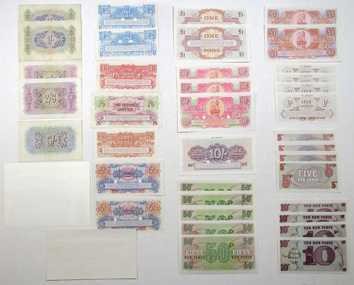 Great Britain, ND (1946-72). Lot of 40+ Issued Banknotes, Includes: 1 Shilling, P-M2 (2); 2 Shillings - 6 Pence, P-33 (2); 5 Shillings, P-M4; 3 Pence, P-M16a; 1 Shilling, P-M18a; 2 Shillings - 6 Pence, P-M19a; 5 Shillings, P-M20c (2); 1 Shilling, P-M26 (2); 5 Shillings, P-M27 (3); 10 Shillings, P-M28a (2); 1 Pound, P-M29 (2); 1 Shilling, P-M32b (4); 10 Shillings, P-M35b; 1 Pound, P-M36a (2); 5 New Pence, P-M44a (4); 10 New Pence, P-M45a (4); 50 New Pence, P-M46a (5). Lot also includes British Rail-International Inc. 20 New Pence Pair of Tickets and Bank of England Trio of Advertising Notes. Banknotes range from VF to AU condition. (41). Sold "AS IS" no returns accepted.