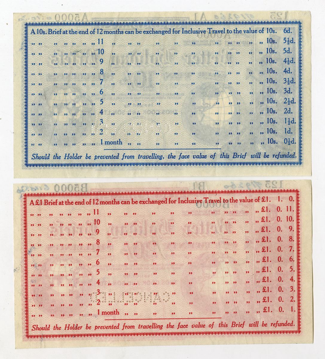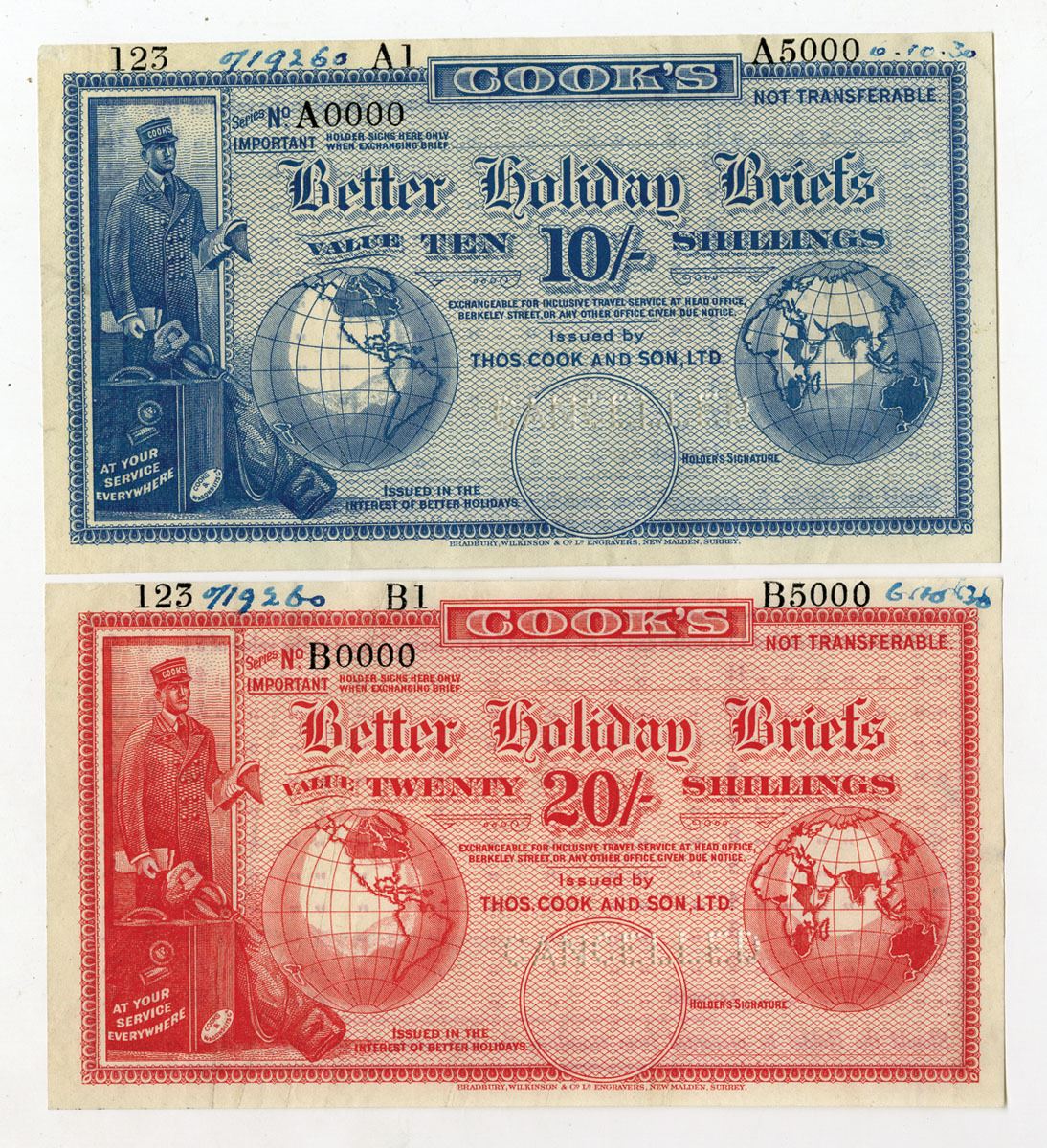Great Britain, 1930. Lot of 2 Brief's Notes - one for 10 Shillings in blue and the other for 20 shillings in red, Both have same image of porter with suitcase at left and are pin punched "CANCELLED", Was evidently used when traveling, possibly for incidental expenses, AU to Uncirculated condition, BWC. (2)