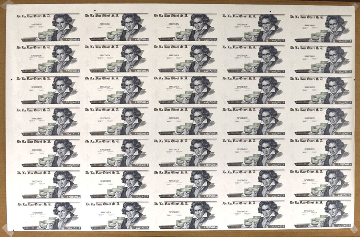 United Kingdom & Italy, ND (ca.2000s). Uncut Sheets of 35 Banknotes, Brown and green print with Beethoven at right, Uniface notes, Specimen overprints, Sheet is in AU to UNC condition.