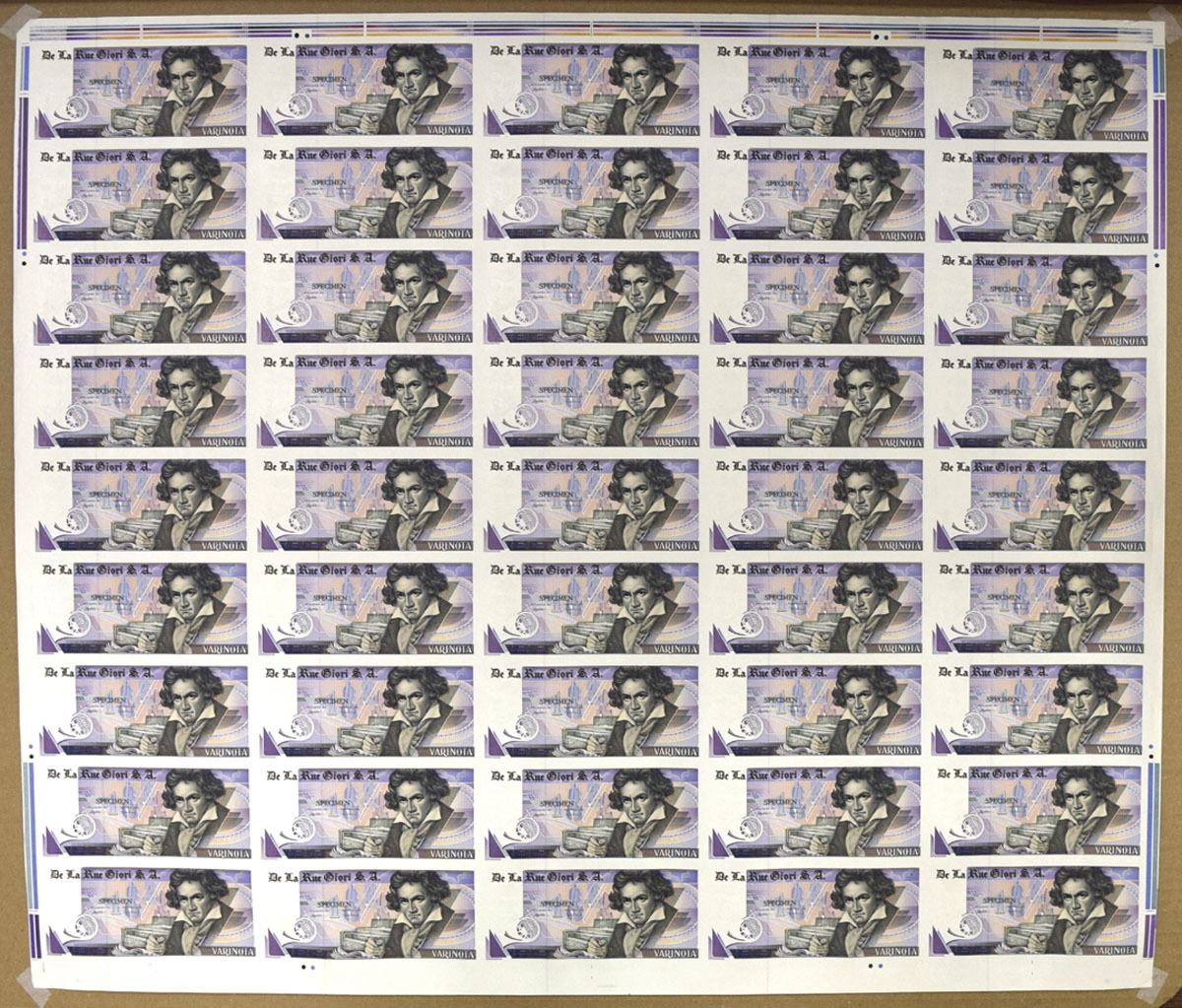 United Kingdom & Italy, ND (ca.2000s). Uncut Sheets of 45 Banknotes, Brown and green on purple and m/c underprint with Beethoven at right, Uniface notes, Specimen overprints, Sheet is in AU to UNC condition.