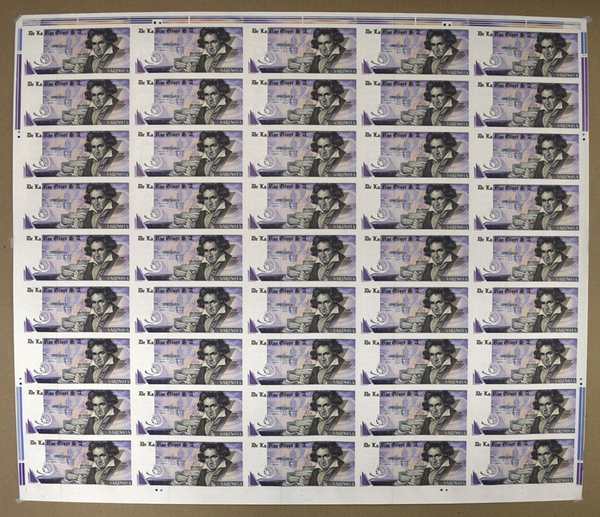 United Kingdom & Italy, ND (ca.2000s). Uncut Sheets of 45 Banknotes, Brown, green and purple on m/c underprint with Beethoven at right, Uniface notes, Specimen overprints, Sheet is in AU to UNC condition.