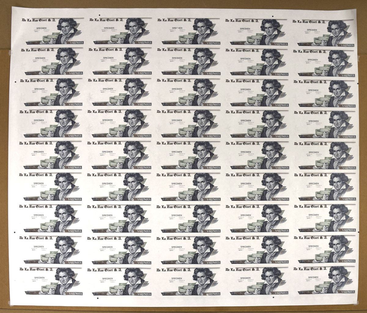 United Kingdom & Italy, ND (ca.2000s). Uncut Sheets of 45 Banknotes, Brown and green print with Beethoven at right, Uniface notes, Specimen overprints, Sheet is in AU to UNC condition.