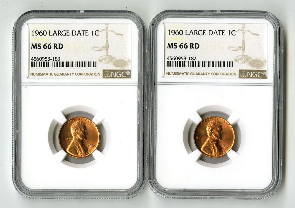 U.S., 1960. 1 Cent, NGC graded MS 66 RD (2), Uncirculated Pair of Coins, Each example displays strong mint luster with full original red color, sharp strike, and excellent eye appeal. Both coins are encapsulated in standard NGC holders with distinct certification numbers. (2). Sold "AS IS" no returns accepted.