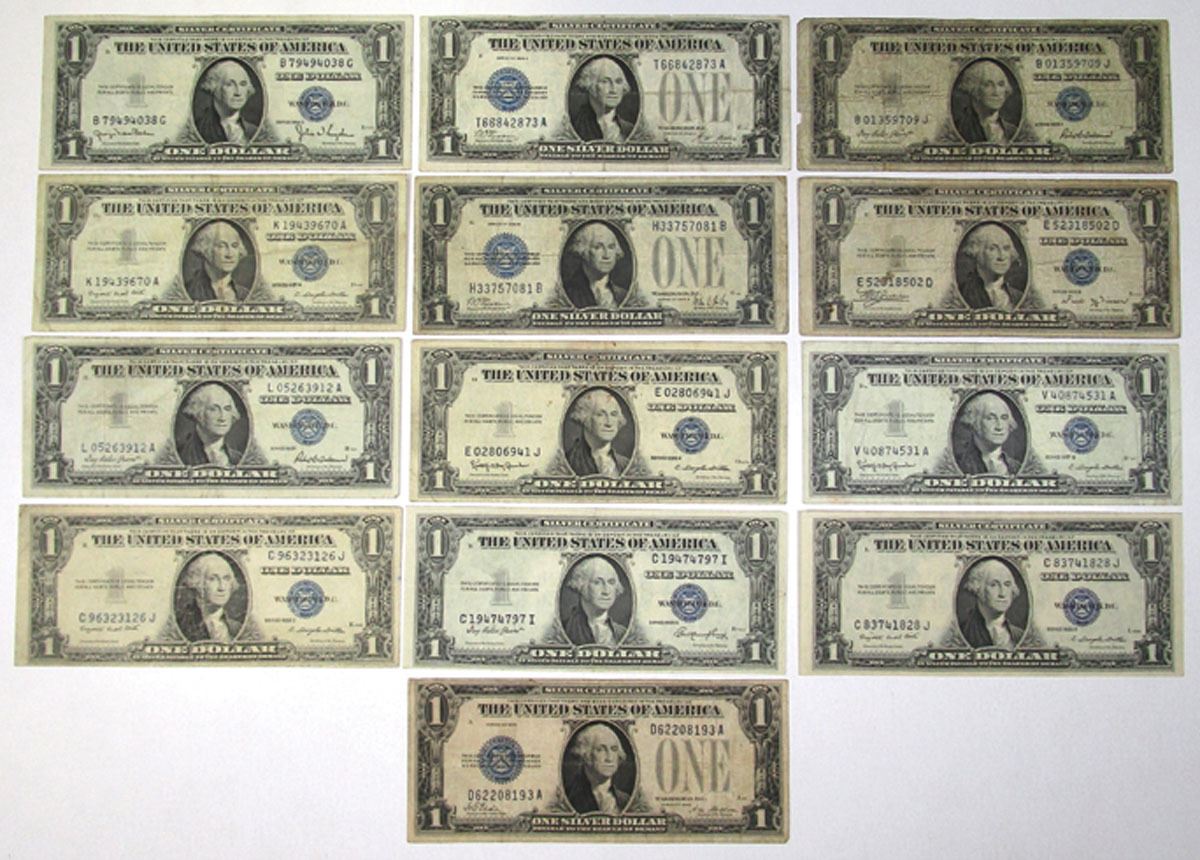 Washington D.C., 1928 to 1957. Lot of 13 different $1 Silver Certificate series, Includes: Series of 1928, Fr.# 1600; Series of 1928A, Fr.# 1601; Series of 1928B, Fr.# 1602; Series 1935B, Fr.# 1611; Series of 1935C, Fr.# 1612; Series 1935D, Fr.# 1613N; Series 1935E, Fr.# 1614; Series 1935F, Fr.# 1615; Series 1935G, Fr.# 1616; Series 1935H, Fr.# 1618; Series 1957, Fr.# 1619; Series 1957A, Fr.# 1620; Series 1957B, Fr.# 1621. Notes range from Fine to VF condition. (13). Sold "AS IS" no returns accepted.
