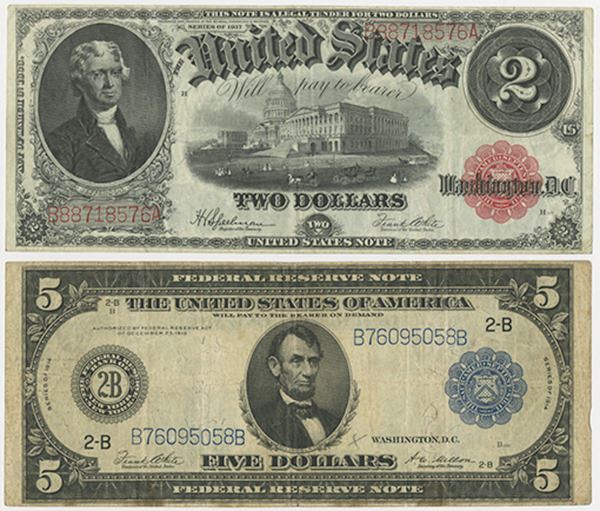 Washington, D.C., Lot of 2 notes, includes Series 1914, $5, F.R.N., Fr.851a, Blue seal, Fine condition; and Series of 1917, $2, Legal tender, Fr.60, Red seal, VF to Choice VF condition with nice ample margins. Attractive pair of notes. (2)