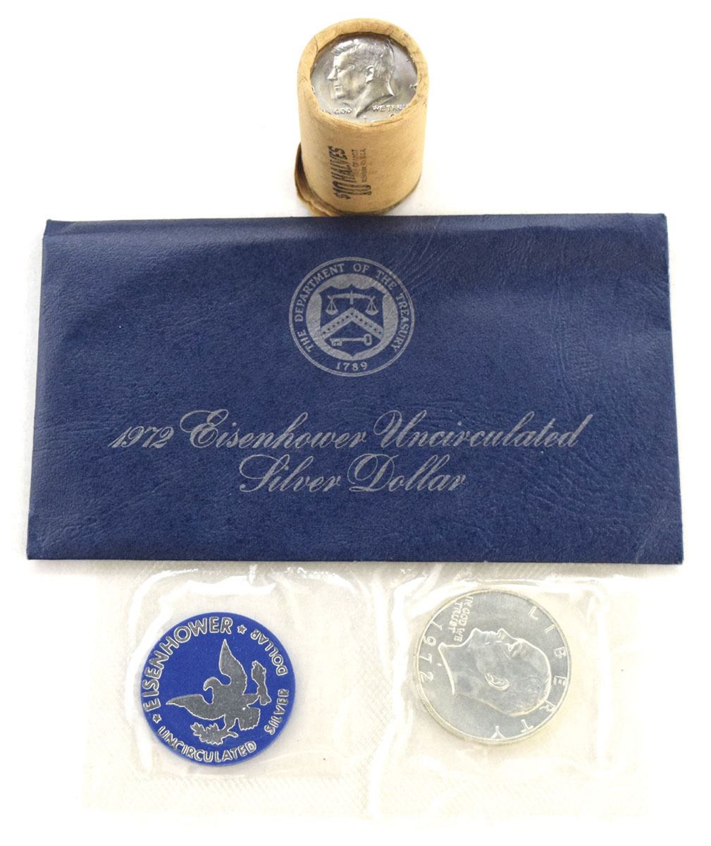 Washington, D.C., 1972. Lot of 21 Coins, Includes: Unchecked roll of Kennedy Half's with a 1972D visible at top; 1972 Eisenhower Silver Dollar from San Francisco Mint in Original Packaging. Coins are UNC to Gem UNC condition. (21). Sold "AS IS" no returns accepted.
