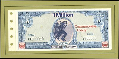1977. Model. 1). Unique model of $5.00 Commemorative Olympic Lottery Ticket mounted on green display board that has information about the ticket. Printed by ABN. Vignette of 3 men running with torches. 2). 4 different "Consumer's Friend" notes that have portions removed to form notes of different color combinations. 3). Additional production material and correspondence included (17 items). Unique production file in archive. Rare Winter Olympic related banknote or lottery ticket. ABN. XF.