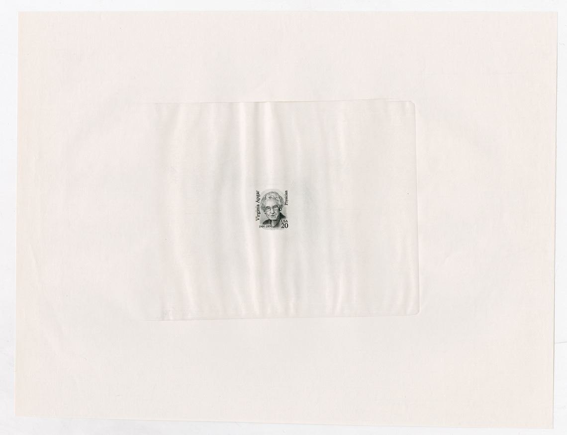 Banknote Corp of America 20 Cent die essay with Virginia Apgar on white paper in black on die sunk LDP paper, Card measures 282 mm X 215 mm, Shows all the design elements and is similar to the issued design but with some differences, mostly in the shading (Scott 2179-E)