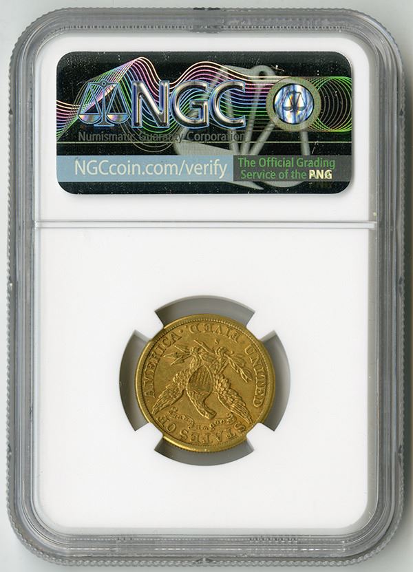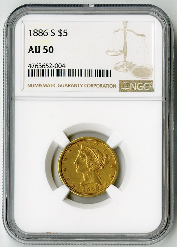 1886-S $5 AU 50, NGC. Weight: 8.36 grams; Metal: 90% Gold, 10% Copper.