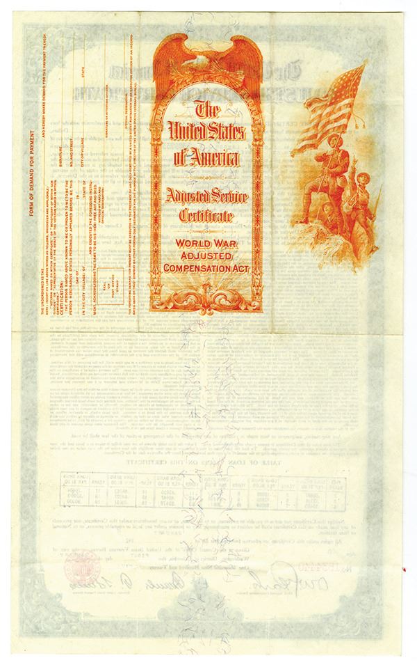 Washington, D.C., 1927. Issued for $1474 to U.S. WWI Army Veteran. 9.75 by 13.25 inches, printed on both sides, black text and title on green border with red seal on bottom right "Veterans Bureau" with eagle and flags, Certificate # 1534440. Back is orange with eagle over title of bond in middle and the right side has patriotic portrait of soldiers holding raised flag on hill. VF condition. This certificate was commonly known as the "Bonus Act" and was awarded to veterans who served in WWI between April 5, 1917 and July 1, 1919, with $1 awarded per each day served in the U.S. and $1.25 for each day served abroad. Extremely rare bond with only 4 known to the cataloger and 2 are in strong hands. No imprint - BEP.
