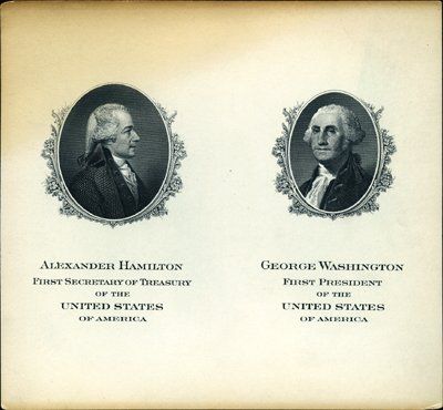 1880-1920. 7 different documents, brochures, advertising cards or vignettes with Alexander Hamilton on them. 1,2) 2 different vignettes of Hamilton facing partially to the left in black and green; 3,4). Proofs of Hamilton facing right , one on glossy white paper and the other on india paper on card; 5). Bank of NY advertising card specimen; 6). ABNC Advertising card with Washington and Hamilton. Toned on top margin; 7). Hamilton, Ohio. First National Bank. Specimen Check by Hamilton BNC with Hamilton on left. Scarce assortment of Hamilton items. Mostly choice condition. ABNC, HBNC, RBNC.