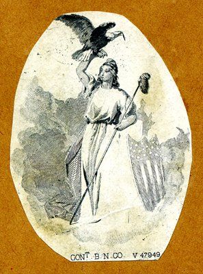 Partially engraved progress proof. ca.1859-1870's. Allegorical patriotic "Liberty" holding eagle proof vignette. Possibly used on obsolete banknotes, stocks, bonds, checks and security printed documents. The vignette is 1.5 to 2 inches in size. Printed on india paper and mounted to archival manila card with plate number on vignette and on card. Vignette is partially engraved with the eagle complet as well as "Liberty's" arm and head, while the rest of the vignette is only outlined or lightly engraved. Printed by Continental BNC. Appears in choice condition. Unique in archive. Please inspect. Dynamic Patriotic female vignette. CBNC.