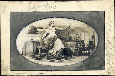 1920-30's. 2 different models of touched up photos of allegorical woman with rod with light bulb by electric generator. Additional text hand written on margins.