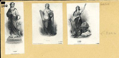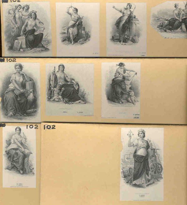 ca.1850's-70's. 14 different proof vignettes printed on india paper and mounted on 5 different production department manila file envelopes. Vignettes include "Fine Art"; "Painting"; "History"; "Justice (Italian)"; "Justice"; "Genius of Steam"; "Intelligence"; "Another Justice" and untitled. Printers include ABNC; RWHE and NBNC. All in VF to XF condition. Scarce group of rare vignettes.