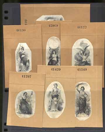 1830-1850's. Proof. 19 different allegorical women vignette proofs printed on india paper and mounted on manila cards with plate numbers on vignettes and cards. Mostly used on obsolete banknotes, checks, drafts or stock certificates. Images include women "Reapers"; Milk maid and numerous other poses. Printers include RWH&E (9); BC&Co.(2); DW&Co. (1); TC&Co. (1) and 6 unattributed. All are in VG to choice condition with some light glue staining and toning and one with internal tears. All unique in archive.