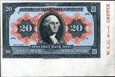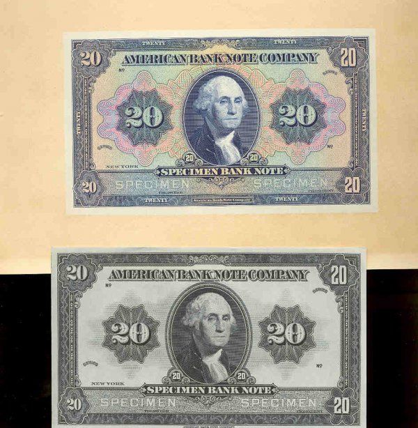 ca.1920's-1950's. 20 3 different variations of ABNC "20 Specimen Bank Note" with Washington Vignette. 1). Specimen, uncancelled. Double sided ad note in black on face and green on back that is off center and cut into right margin. Same note face on both sides in different colors. No undertints; 2). Specimen, uncancelled, uniface. Black on orange cycloid and light blue undertint. Large margins on right and bottom; 3). Proof on large card. Dark blue on m/c undertint. All are in Unc. to choice Unc. condition. Scarce group. ABNC.