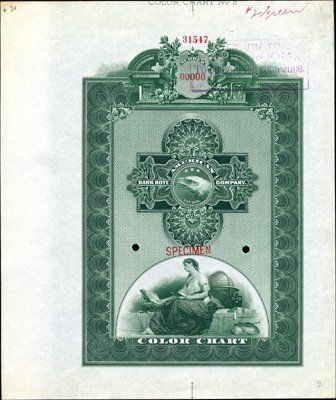 ca.1890-1970's. 3 different color chart specimens and one additional proof of silver medallion on yellow paper. 1). Early Color chart specimen (ca.1880-90's) with seated allegorical woman with globe, ABNC Eagle logo and ornate stock or bond type of border in green; 2, 3). Modern counter-parts of previous color chart (ca.1960-80s). Stock and bond borders with facsimile corporate seals on bottom of page and allegorical man and women in front of wheel of progress and silver medallion on upper right corner. One of the color charts is "15 Brown" and the other in "19 orange". 4). Yellow sheet of paper with proof impression of silver medallion found on the modern color charts. All in choice condition. Scarce group of color sample advertising sheets. ABNC.