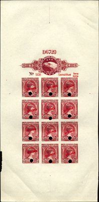 1890's-1900's. 2 Specimen Color sample sheet "No.508, Sensitive Terra Cotta" with ABNC eagle logo on top and 12 "Experiment Specimen 2" stamps below. Design of "Experiment Specimen 2" stamps are of Liberty with cap facing right. Each stamp has Red specimen overprint and POC. Back of sheet is gummed. Choice Unc. condition. ABNC.