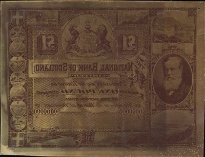 U.S. American BNC Essay Banknote Tin Type Photo Proof. ca.1880-1890's. Photo proof tin type of essay banknote for "The Bank of Scotland". Photos of face and back are on 2 different 6.5 by 5 inch thin metal (tin?). Vignette of Dom Pedro from Brazil is used on the face as well as other non Scotish related vignettes except for the title. The photos are of a model or mock up and not of a finished proof or specimen. They appear very dark but are legible and are printed in reverse. Also included is a bank note sized photo of a "United Kingdom of Great Britain and Ireland, 1 Pound specimen banknote with John Bradbury's signature on bottom. Unique in archive. Choice condition. ABNC.