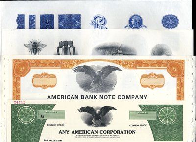 ca.1960-90's. 4 different certificates. 2 are specimen sample or advertising stock certificates and 2 are vignette sheets with multiple vignettes. Vignettes include eagle, steamship, locomotive, bee, allegorical figures, counters and border engravings. 1). American Bank Note Co. Ad sheet with eagel and orange border. List of locations for additional computer fed stock certificates for testing purposes; 2). "Any American Corp."with eagle vignette and green borders. All are scarce. Interesting assortment. ABNC.
