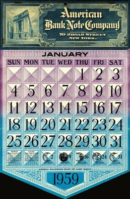 1959. Complete multi-color advertising calendar for ABNC with their building on top and all 12 monthly pages intact. Each monthly calendar page has either the Chicago or the New York Prining plants on them or text of all of the services of the company. The top part of the calendar with American Bank Note Co. on it is printed in green while the monthly pages are printed in multicolors. Rare advertising calendar and the only intact issued one found in the archive. ABNC