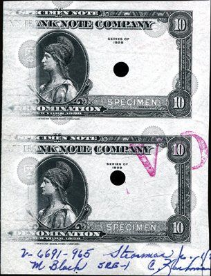 1970-1980's. P-unlisted. 10 Tyvek banknote vertical pair. Experimental Tyvek note with U.S.Treasury Seals very similar to those used on U.S.Currency. Notes have one large hole punch near central vignette and partial "VOID" hand stamp in purple. The left 1/2 of each note is fully printed, but the left 1/2 was not inked and the note fades out to the left. Archival notes on bottom. XF-AU. Rare Tyvek item. ABNC.