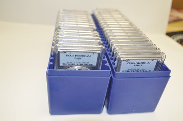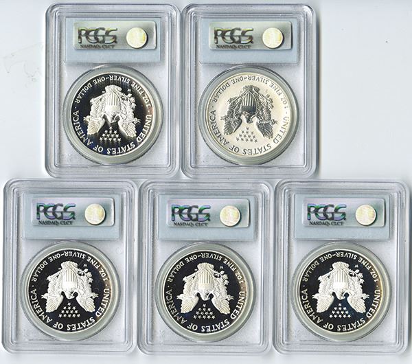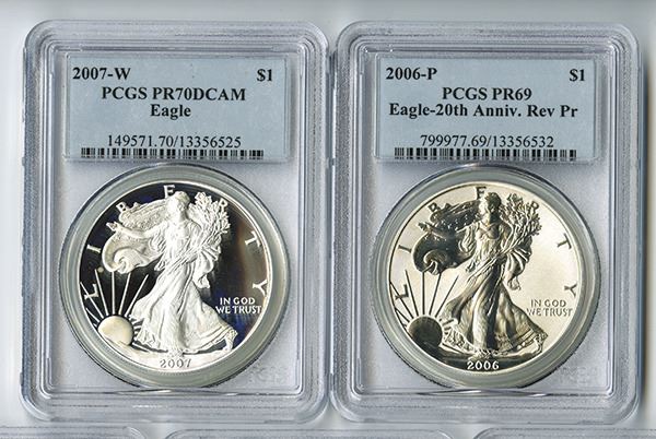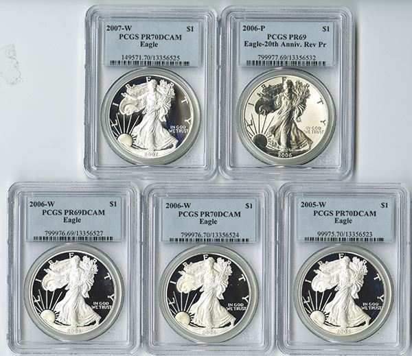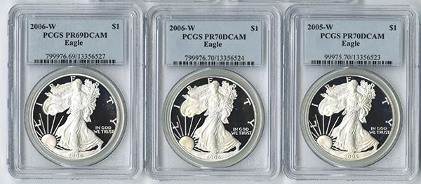 U.S. Silver Eagle group of 33 coins, Highlights include 2005 W; 2006 W and 2007 W, All PR70Dcam; 2006-P PCGS PR69 Rev.Proof (2); Missing the key issues with the balance mostly PCGS PR69DCAM with 5 grading PR68DCAM examples. All 1 ounce silver coins. (33)
