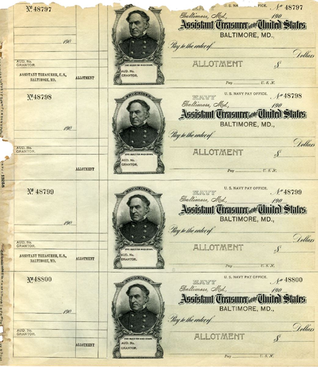 Baltimore, MD. 190x (ca.1900s), Uncut Sheet of 4 remainder checks, portrait of Farragut at left, U.S. Navy Pay Office, Allotment Check, Black printing, Uncirculated except for the top check which has damage and is missing the top 1/2 inch of the design ans well as very slight damage on the left counterfoil border far from design. S/Ns 48797 to 48800. No printer listed, but it appears to be a B.E.P. printing.