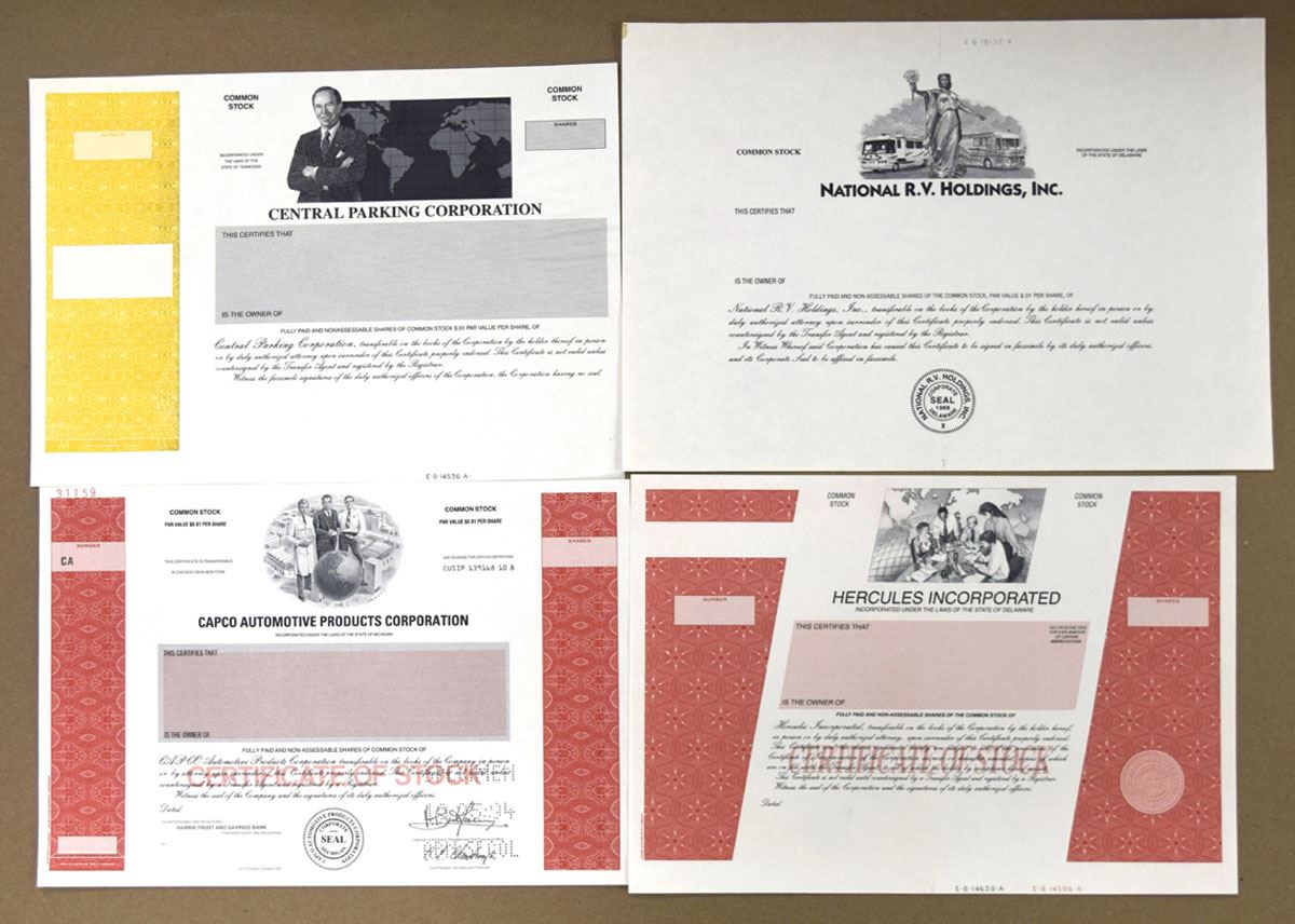 Lot of 8 items, featuring Central Parking Corporation, a major operator of parking facilities across the U.S., proof with yellow border; National R.V. Holdings, Inc., a manufacturer of recreational vehicles and motorhomes, proof with black border; Autocraft Industries, Inc., a supplier of automotive components and aftermarket products, proof with blue border; Capco Automotive Products Corporation, a maker of automotive parts and systems, proof with red border; Hercules Incorporated, a chemical and materials manufacturer that also supplied specialty products for automotive applications, proof with red border; Discount Auto Parts, Inc., a regional auto parts retail chain later merged into Advance Auto Parts, proof with red border; Meritor Automotive, Inc., a global supplier of drivetrain and braking components for heavy-duty vehicles, proof with green border; and American Axle & Manufacturing Holdings, Inc., a leading manufacturer of driveline and drivetrain systems for the automotive industry, proof with blue border. All are face-only stock certificate proofs with blank reverses and were printed by the American Bank Note Company; overall condition is Very Fine to Uncirculated (8).